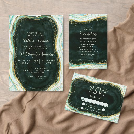 Blauwgroen Groene & Gouden Agaat Marmeren Geode, met Sprankelende Gouden folieaccenten, en Modern trendy geborsteld scriptlettertype. Blauwgroen groene, smaragdgroene en witte stenen look, is luxueus en modern voor uw bruiloft - Gepersonaliseerde bruiloft uitnodigingen! ~ Controleer mijn winkel om de volledige bruidssuite voor dit ontwerp te zien!
