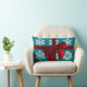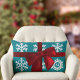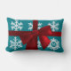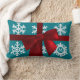 Zeer feestelijk lumbaal kussen met een faux rode strik op een rijke blauwgroen achtergrond met handgetekende sneeuwvlokken, waarvan er één ruimte heeft voor uw initiaal. Perfecte aanvulling op uw vakantie decor
