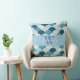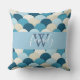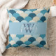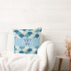Pastelblauwe schalen werpen kussen met aangepaste monogram in elegante lettertypen voor een perfecte decor aan de kust
