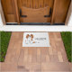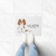 Destei's originele cartoon illustratie van een schattige blenheim-kleur Cavalier King Charles Spaniel die zit. Er is ook tekst die nu "Welkom" samen met een aanpasbaar tekstgebied voor een familienaam of andere aangepaste tekst leest. De achtergrond heeft een patroon van grijze pootafdrukken.