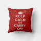 Leuke, grappige en inspirerend "Blijf kalm en ga verder" kussen van een wwii britse oorlog poster, helpt je een koel hoofd te houden in stressvolle tijden. beschikt over witte tekst en kroonembleem op een verontruste rode achtergrond.