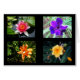 Een collectie van vier bloemen, met een zwarte achtergrond en een blanco kaart aan de binnenkant.