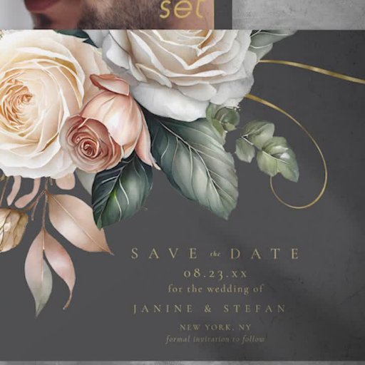 Deze bruidssuite met weelderige, dramatische bloemen van romig wit tot blush roze, gouden wervelaccenten en prachtige, houtskoolgrijze waterverf achtergronden, creëer heeft een elegante, romantische sfeer, die slechts een hint geeft van wat gasten kunnen verwachten op uw grote dag. Deze elegante foto-achtergrond, hier getoond op een optionele donkergrijze achtergrond van houtskool, biedt een sjabloon om gemakkelijk uw namen en trouwdatum toe te voegen. Zoek ID1022 om alle producten in deze bruidssuite te zien.