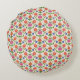Een Sierkussen met een kic Round, met een kleurrijk patroon van roze en Oranje bloemen en poka-stippen op een bladtextureerde Ecru-achtergrond. Als onderdeel van het collectie Posh & Painterly 'Rangoli' kan dit stijlvolle patroon worden aangepast aan elke piloot.