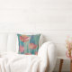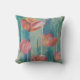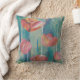 gooien kussen met heldere bloemen van rood, roze en oranje op een waterige blauwe achtergrond. Originele Bloemen in het kunstwerk van de Regen dat met een mengeling van collage, waterverf en pastel wordt gedaan.