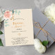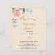 Een beige achtergrond. Versierd met een rozen gouden en blozend roze bloemblaadje, rozen bloemblaadjes en groene watergekleurde eucalyptusbladeren, takjes, groen en een nepgouden tak. Personaliseer en voeg de naam van de bruid toe om te zijn en feestdetails. Zwarte en goudkleurige letters. 1 vel = 1 uitnodiging afgedrukt rand tot rand.