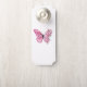 Langwerpige opstelling van roze vlinder met roze Japanse kersbloesems op witte achtergrond.