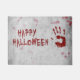 Een vreselijke Halloween-illustratie met een bloedige handdruk en bloedspatten op een grijze achtergrond.