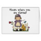Een meisje neigt naar haar tulpen terwijl een vogel erop kijkt en de tekst luidt: "Bloom waar je bent geplant!" op tuinkleding, mokken, muismatten, stickers, kaarten, knoppen, tassen en nog veel meer.