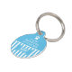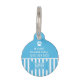 Een ID-label voor honden in blauwe kleur, met een bot met de naam van de hond en een pootdruk met contactgegevens voor de eigenaar.