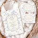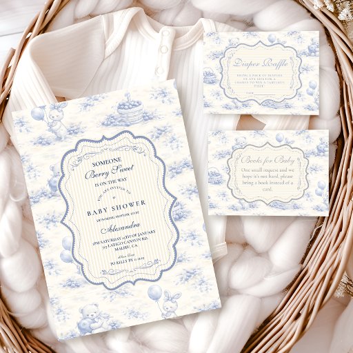 Een zoete, vintage-geïnspireerde ontwerp met delicate blauwe strikken, zachte gestreepte details en charmante afbeeldingen van een blauwe bessentuin. Toile-achtige kunst met adorable dieren en fruitmanden geeft een klassieke sprookjesboek-sfeer in een zachte poederblauwe kleurstelling. De sierlijke centrale lijst voegt elegantie toe terwijl de algehele look licht, verfijnd en tijdloos blijft. Perfect voor een babyshower met een zachte tuinthema en een vleugje traditionele charme.