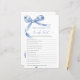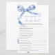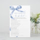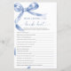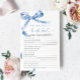 Blue Bow "Who Knows The Bride Best" Game – Voeg wat plezier toe aan je vrijgezellenfeest met deze charmante spelkaart met een delicaat blauw boogontwerp. Deze "Who Knows The Bride Best" -game is perfect voor het boeien van gasten en het vieren van de bruid-to-be in stijl. Met een elegant script en vrouwelijke accenten is deze speelkaart een mooie aanvulling op elk thema van het vrijgezellenfeest, waardoor het een gedenkwaardige herinnering is voor de bruid en haar geliefden. *** Voer H124 in de zoekopdracht in de winkel in om alle overeenkomende items te vinden *** Of bezoek ons Blue Bow-Collectie. *** Dit hoogwaardige ontwerp is gemakkelijk aan te passen aan uw trouwkleuren, stijlen en thema. Klik voor verdere aanpassingen op de link Bewerken met de ontwerptool en gebruik onze ontwerptool om deze sjabloon te wijzigen. Neem contact met mij op als u hulp nodig hebt of overeenkomende objecten nodig hebt.