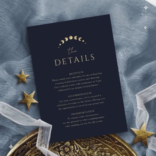 De "Blue Celestial Wedding Enclosure Kaart" is een hemelse fluistering tegen een diepe blauwe achtergrond, die naadloos aansluit op uw huwelijksuitnodigingssuite. De halve maan, sterren en maanfasen creëer hebben een harmonieuze samenstelling, terwijl de stijlvolle eenvoudige aanpasbare initialen van het paar een persoonlijke touch toevoegen, waardoor er lagen van symboliek worden toegevoegd aan de gegevens die u wilt delen.