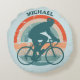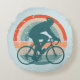 Op deze werpkussens wordt een blauwe silhouette-cyclist geplaatst op een retrostijlcirkelvormige regenboogachtergrond van noodlijdende strepen. De rug van de kussen heeft het zelfde afbeelding met een tekstgebied dat jouw naam kan houden.
