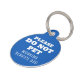 Vet blauw label met het bericht "niet aaien, werkende hulphond" op de voorkant en ruimte om de naam van het huisdier en een telefoonnummer of een aangepast bericht op de achterkant toe te voegen.