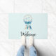 Welkom doormat met een waterverf droamcatcher. Blauwe, turquoise- en crèmekleurige kleuren. Verkleurd met veren, kralen en bloemen.