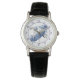 This beautiful watch features a blue and white swan at the center. Floral images are formed within the swan's wings. Dark blue numbers make the watch easy to read, and a thin matching blue circle frame separates the bird from the numbers on the circular border. Everything stands out on a crisp white background.