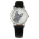 Destei's originele cartoon illustratie van een schattige blauwe kleur: het hoofd van de Franse Bulldog / Frenchie-rashond dat enigszins gekanteld is. Het klokgezicht bestaat uit minimale zwarte lijnen, maar een deel ervan is verborgen achter het afbeelding van de hond.