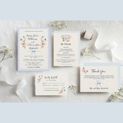 Floral Wedding rsvp card with beautiful romantic delicate watercolor wildflowers in blue and pink, on a vintage cream background. Easy to personalize wedding details wordings in a lovely fonts. Pretty country wedding style.