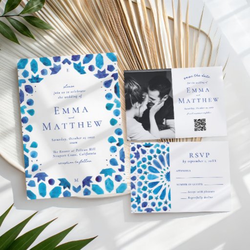 Breng je gasten naar de zonnige oevers van de Middellandse Zee met onze voortreffelijke bruine huwelijksuitnodiging. De Marokkaanse en Spaanse tegel motieven, intens ontworpen in levendige tinten van blauw, creëer een superieure elegantie die perfect is voor een doelbruiloft of voor een viering aan de kust. De details van de waterverf en de elegante manuscriptdoopvont brengen een gevoel van sereniteit en verfijning aan deze uitnodigingsreeks. Dit unieke ontwerp zal uw gasten fascineren en zal hen ongeduldig voorzien van uw speciale dag.