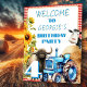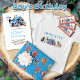 Jongens boerderij-thema verjaardagsfeestje servetten. Blauw tractorontwerp met aangepaste blauwe tekst. Een grappige koe kijkt van achter de tractor, terwijl een puppy in de buurt zit. Een kleine gele kat zit bovenop de tractor en een blauwvogel vliegt boven het hoofd. Handgedrukte tekst is allemaal hoofdletters en voorbeeldtekst is "Happy Birthday (Georgie) is 4". Het ontwerp heeft een gelaagde uitstraling en wordt begrensd door goudbruin hooi.