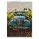 Deze kaart bevat een foto van een oude, blauwe, vrachtwagen in een veld. Leeg binnen.