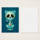 Dit schattige blauwe kittenontwerp is gedecoreerd met zwenken en puntpatronen. Gele bloempedalen omcirkelen de zuivere zwarte ogen in de traditie van de Dag van de Dode suikerskulls. De kat zit neer en kijkt uit met zijn staart op de achtergrond. De overmaatse kop zit op een piepklein lichaam dat een speelse, cartoon-achtige verschijning creëer. In het midden van het voorhoofd van de kitten zit een ster met vijf punten, terwijl er in het midden van de borst een helder rood en geel hart verschijnt. Deze leuke kleine kat is een leuk en stijlvol design geïnspireerd door de prachtige patronen van de Dag van de Dode suikerskulls.