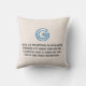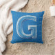 A detailed blueprint-style illustration of the letter G is presented against a vibrant blue background. The letter itself is rendered in white, with intricate details and precise measurements indicated by thin white lines. The back of the pillow includes a blue outline of the letter G set against a textured light beige background with a 4-line poem about the letter below.