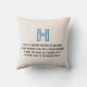 A detailed blueprint-style illustration of the letter H is presented against a vibrant blue background. The letter itself is rendered in white, with intricate details and precise measurements indicated by thin white lines. The back of the pillow includes a blue outline of the letter H set against a textured light beige background with a 4-line poem about the letter below.