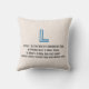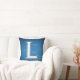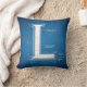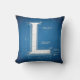 A detailed blueprint-style illustration of the letter L is presented against a vibrant blue background. The letter itself is rendered in white, with intricate details and precise measurements indicated by thin white lines. The back of the pillow includes a blue outline of the letter L set against a textured light beige background with a 4-line poem about the letter below.