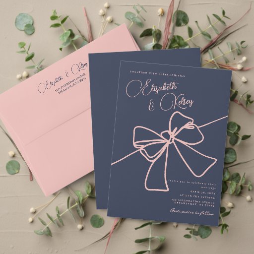 Deze mooie huwelijksuitnodiging heeft een diep leisteen blauwe achtergrond die sophisticatie uitstraalt, aangevuld met een delicate, roze blush boog in het midden voor een vleugje romance. De blush roze belettering verbetert de zachte en sierlijke esthetiek, waardoor het perfect is voor koppels die op zoek zijn naar een tijdloos maar modern ontwerp. Ideaal voor klassieke, chique en elegante huwelijksthema's, deze uitnodiging zet de toon voor een echt gedenkwaardige viering.