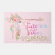 Girly blush roze and gold boho floral vether Summer Vibes doormat. Deze doormat kenmerkt de woorden "Summer Vibes" in heet roze, paars en aqua, met gouden glitter sparkles confetti. Deze doormat is ook voorzien van een dunne gouden, roze, perzikkleurige, lila, paarse, blauwe, groene en turquoise boho vetherpijl.