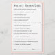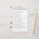 Een leuk idee als een baby shower spel, deze vraag en antwoord spel beschikt over veel geliefde kinderkamer rijm vragen. Elke gast krijgt een spelletjesblad en vult zijn antwoorden in. Zodra iedereen zijn antwoorden heeft voltooid, roept de host of game-beller de vragen op en geeft hij de juiste antwoorden. De gast met de meest correcte antwoorden wint een prijs! Dit ontwerp in blush pink met een bloemmotief op de rug coördineert met een "baby in bloom" baby showers collectie in dit roze bloementhema. Hier zijn de antwoorden op de vragen op de spelkaart: 1. Kersttaart. 2. vier en twintig. 3. een pik pepers in het zuur. 4. slager, bakker, kandelaar maker. 5. vol van genade. 6. een pony. 7. om een emmer water te halen. 8. kuste hen. 9. de vrouw van de boer. 10. een bot. 11. zijn avondmaal. 12. Een Pieman. 13. zilveren klokken, kokkelwielen, dienstmeisjes allemaal op een rij. 14. Een varken