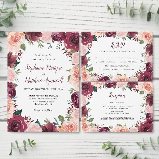 Floral Blush Burgundy Rose Border WeddingOntworpen door Gail K