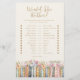 (Kies MATT papierafwerking - NIET halfglans - om op te schrijven.) Vermaak uw gasten met het boekenspel "Zou ze liever?", met grillige waterverf-illustraties op de voorkant en een coördinatiepatroon op de achterkant. Dit spel combineert literaire romance met plezier, waarbij je je gasten betrekt bij speelse keuzes over de bruid-to-be.