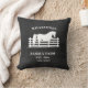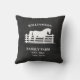 Boerderij/ranch decoratorkussen met een wit paard op een zwarte achtergrond. Gepersonaliseerd met uw familienaam, vastgestelde datum, en plaats.