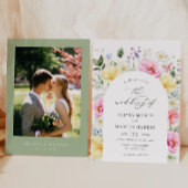 Boho Arch Kleurrijke Floral Spring Garden Elegante foto bruiloft uitnodiging Deze bruiloft uitnodiging beschikt over een prachtige bloemen en salie groene botanische boog gemaakt van kleurrijke bloemen in roze, sinaasappel, blauw, geel en wit. Bewerk de achterkant van de uitnodiging met uw foto. De lichte salie groene achtergrond is prachtig voor lentetuinen en kleurrijke bloemenbruiloften.