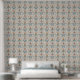 Whimsical en boho behang voor een meisjeskamer of kinderkamer met handgetekende illustratie van linten en bloemen in blauwe en bruine kleuren.