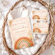 Een warm en modern boho baby shower ontwerp met een zachte neutrale regenboog in aardse terracotta-, salie-, perzik- en zandtonen. Delicate gedroogde bloemen en subtiele textuurdetails creëren een organische, minimalistische look die zowel knus als verfijnd aanvoelt. Perfect voor het vieren van een aanstaande moeder die van natuurlijke paletten, moderne bohemiense styling en tijdloze eenvoud houdt.