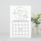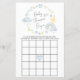 Kute whimsical baby bingo douchespel met blauw en gele waterverven van een regenboog, zon, harten, sterren, manen en wolken en "Baby shower Bingo" in een stijlvol script.