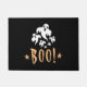 Op deze halloween-doormat staan een spookbeeld-ornament en de "Boo"-letters.