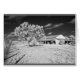 Zwart-witte infraroodfoto van een schuur, boom en hek op een Zuid-Texas ranch.