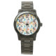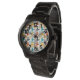 Dit mannen horloge heeft een modern ontwerp uit het midden van de eeuw van boemerangvormen en kurkvormen in retro kleuren.