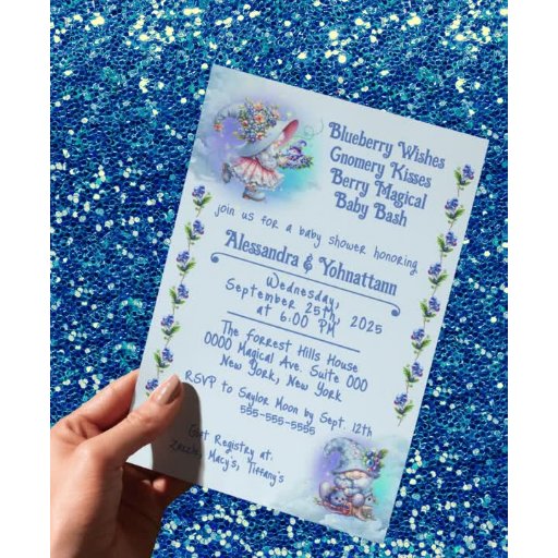 "Wensen van bosbessen en kabouterkussen" is een uitnodiging die prachtig het wezen van het vieren van een nieuw leven weergeeft. Dit ontwerp bevat wolken, blauwe en paarse tinten, waardoor het geschikt is voor een baby boy shower, terwijl de kaboutermeisjes in moppige rokjes het ook geschikt maken voor een baby girl shower. Dit betoverende thema van bosbessen en kabouters belichaamt de magie van het verwelkomen van een nieuwe baby. De charmante beelden van sappige bosbessen in combinatie met de grillige kabouters zorgen voor een uitnodiging die vreugde en verwondering oproept bij alle gasten. Maak je baby shower onvergetelijk! Bekijk onze collectie voor meer leuke ideeën om deze bijzondere gelegenheid te vieren.