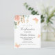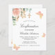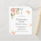 Een witte achtergrond met eucalyptusgroen, een roos goud en een wazige roze roze roos, gouden bladeren en vlinders. Personaliseer en een naam en ceremoniedetails.