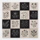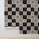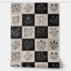 Decorative throw pillow with botanical floral leather-look patchwork design. Vintage flower illustrations on stitched leather-style squares creating artisan quilt aesthetic. Black, white, and beige rustic pattern. Perfect for rustic home decor, cottage core living room, or farmhouse bedroom style.
