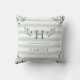 Deze trendy kussen kenmerkt groene waterverf bladeren op sage groene strepen, met jouw naam en initiaal. Gestreepte achtergrond via Indie Grace Design.