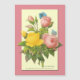 Een magnetkaart met een antiek reproductie van roze en gele rozenbloemen botanisch kunstwerk van de beroemde kunstenaar Pierre Redoute met blauwe vlinders op een roze achtergrond.