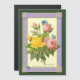 Een magnetkaart met een antiek reproductie van roze en gele rozenbloemen botanisch kunstwerk van de beroemde kunstenaar Pierre Redoute met blauwe vlinders. Het faux-lijst wordt gemaakt met de tekens van printers in golds op blauw tegen een diepe groene achtergrond van het faux canvas.