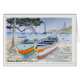 Waterverf van een paar boten op het zand in Bequia in de Grenadines, West Indies.